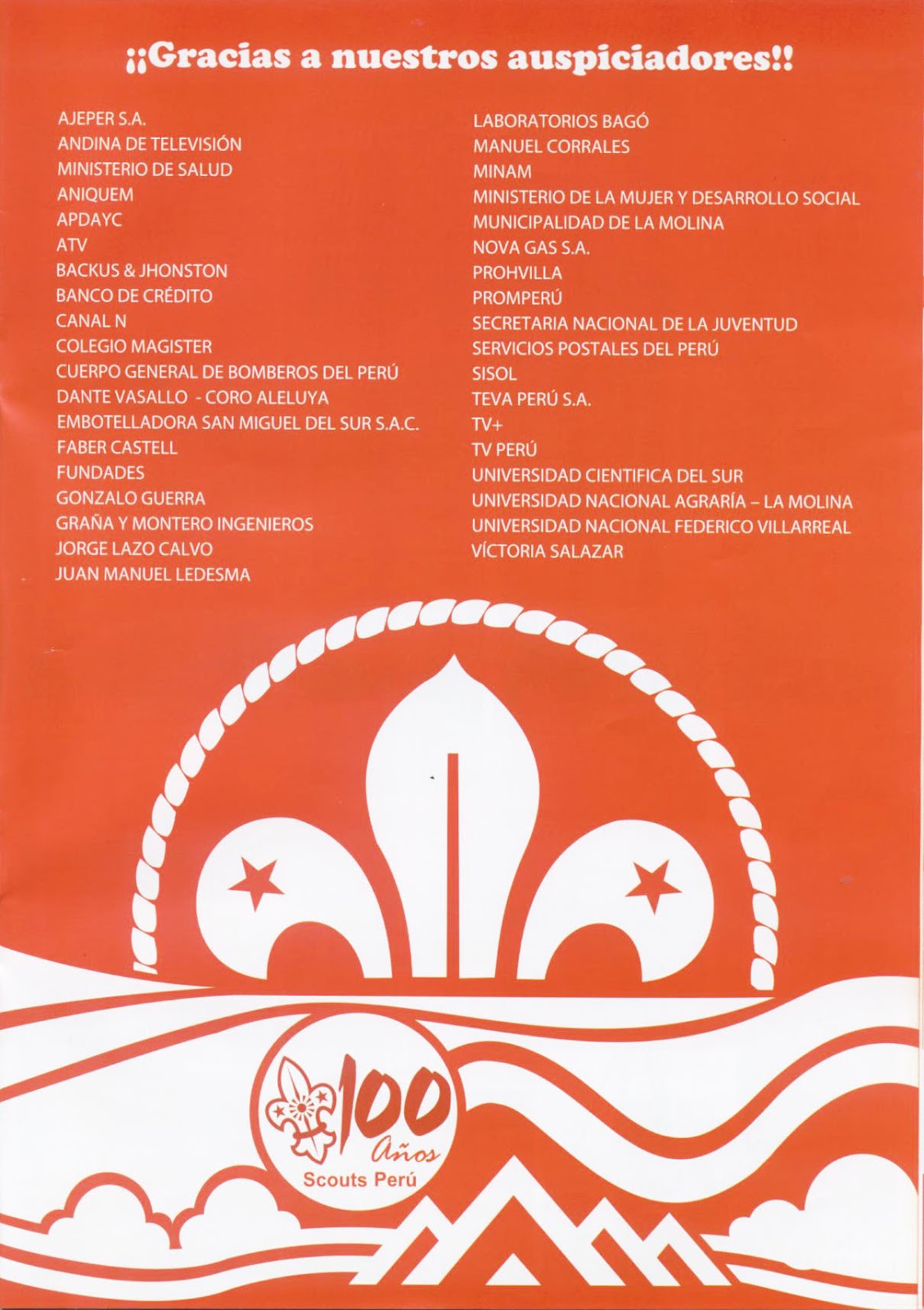 Asociación de SCOUTS del Perú, fundada en el año de 1911, agradece a través del Vicerrectorado Académico a la UNFV por haber auspiciado el “Jamboree Centenario del Perú”. Este evento se llevó a cabo por los 100 años de fundación, y contó con delegaciones de Scouts del Perú y del extranjero, y la UNFV contribuyo al éxito logrado auspiciando dicha actividad.